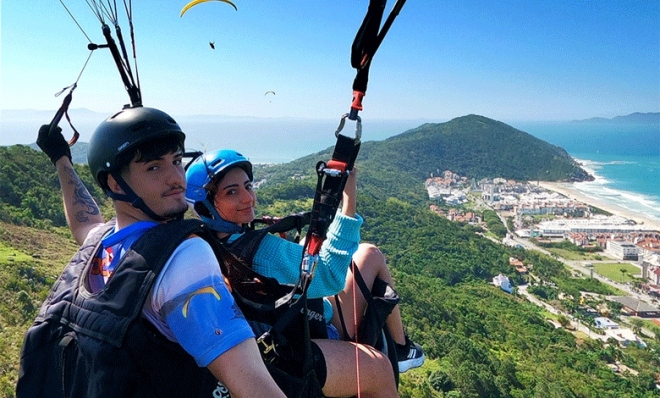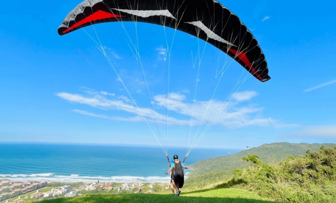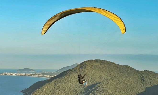 - Duração total da experiência entre 45 min a 1h15 no total, contando: chegada e recepção no Mirante da Praia Brava, instruções de segurança, preparação dos equipamentos, espera por condições ideais (se necessário) e voo de aproximadamente 10 a 15 minutos.