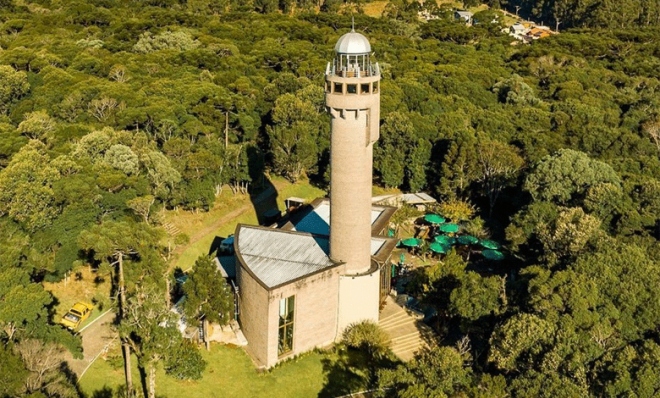 - A construção, em pedra basalto, chama a atenção por ser a réplica de um farol com 32 metros de altura, de onde é possível avistar municípios como Gramado, Caxias do Sul e São Francisco de Paula.