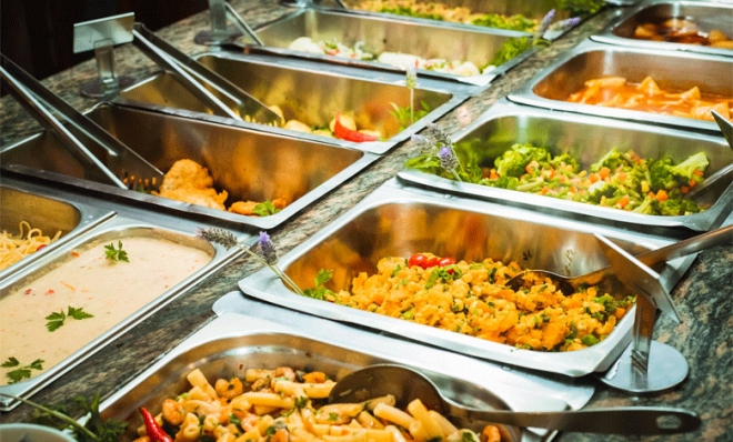 - Buffet self-service com pratos quentes e saladas.