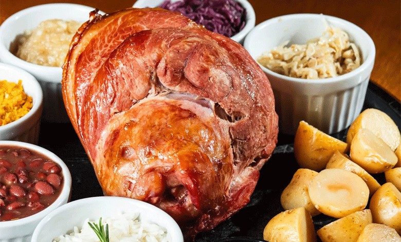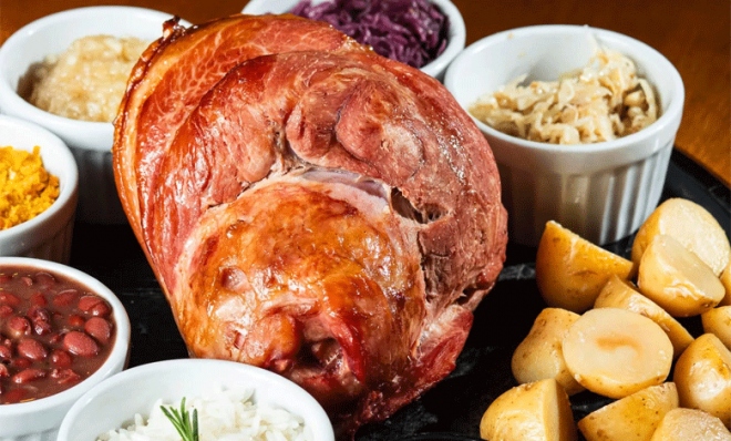 - Guarnições: chucrute artesanal, repolho roxo agridoce, batatas confitadas em ervas, purê de maçã, salsicha cervelá ao vinagrete da casa e o toque brasileiro com arroz, feijão, fritas e farofa.