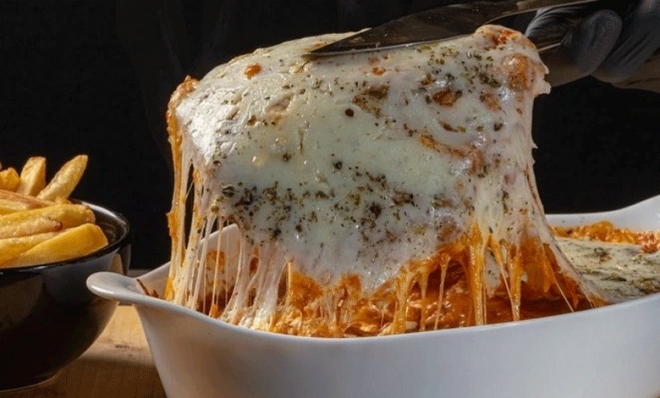 - Parmegiana de frango para 2 pessoas: dois filés de frango marinados empanados, fritos e assados ao molho sugo da casa para garantir uma carne extremamente branca, macia e suculenta com queijo gratinado.