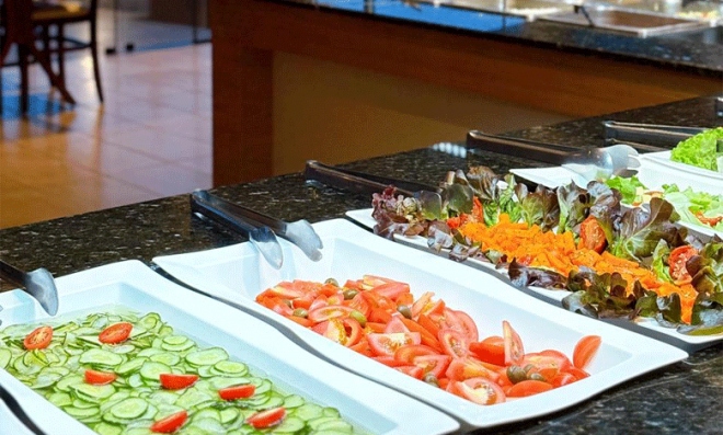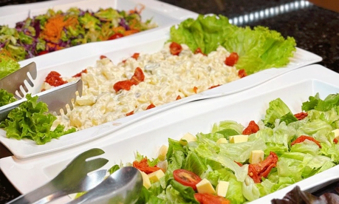 - Buffet livre de saladas, massas, carnes assadas, pratos quentes, pratos vegetarianos e para finalizar buffet de sobremesas, café e chás.