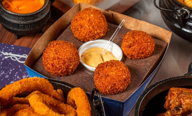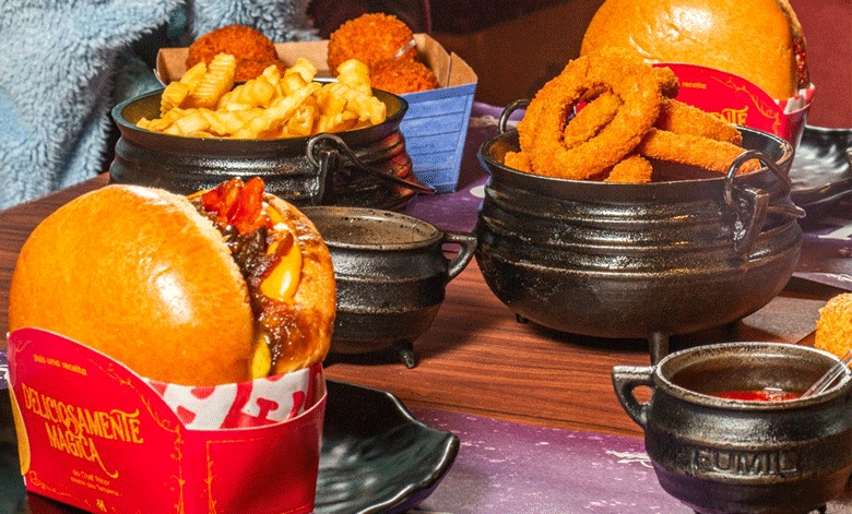 - Feitiço de Molhos Infinitos – Cheddar, farofa de bacon, geleia de pimenta e molho barbecue.
