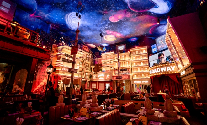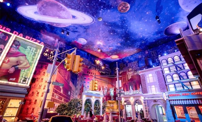 - Inspirada nas ruas de Nova York, com cabines de táxi, arranha-céus e cenários cinematográficos, a pizzaria transforma o jantar em uma experiência imersiva para toda a família.