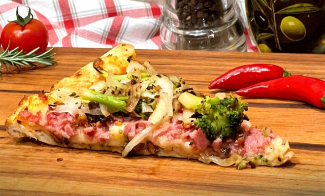 - • À Moda do Pizzaiollo (calabresa, filé, tomate picado, azeitonas fatiadas, bacon, cebola).