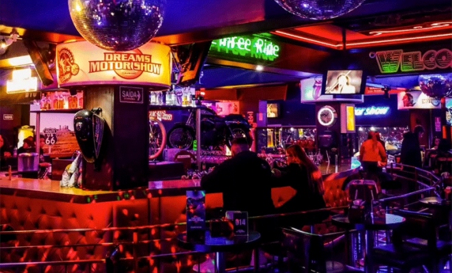 - • Ambiente Temático: Um bar estilo casino de Las Vegas, com iluminação neon, música animada e decoração inspirada no mundo das corridas.