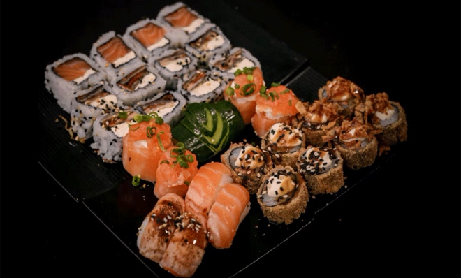 NAGATO SUSHI: combo com 28 peças (12 Uramakis, 8 Hots, 4 Joys e 4 Niguiris)