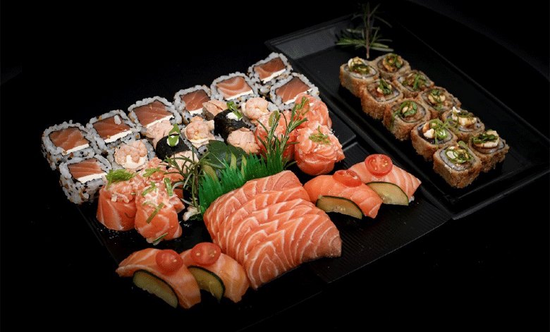 NAGATO SUSHI: combo com 40 peças (11 Uramakis, 6 Joys, 7 Niguiris, 10 Hots e 6 Sashimis)