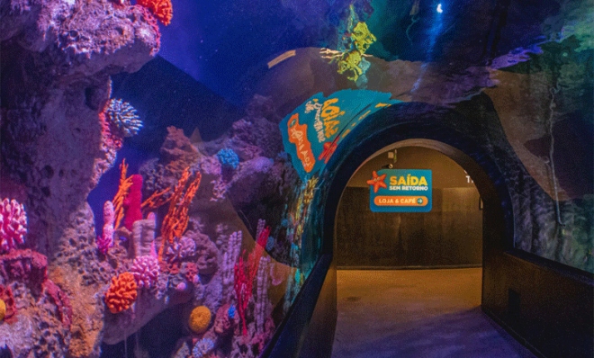 - Passe por um túnel transparente e sinta-se imerso no fundo do mar, cercado por tubarões, raias e peixes coloridos que nadam bem acima da sua cabeça.