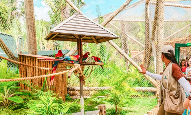 - Aviários: Em três aviários de imersão, os visitantes podem observar, em trajetos monitorados por educadores ambientais, cerca de 250 animais, incluindo aves da fauna brasileira, répteis e pequenos mamíferos. Cada aviário oferece uma experiência única, com espécies distribuídas conforme o porte e as características de cada espaço.