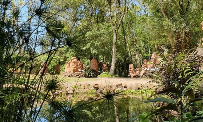 - Trilhas arborizadas que conectam as esculturas, com placas explicativas em português e alemão.