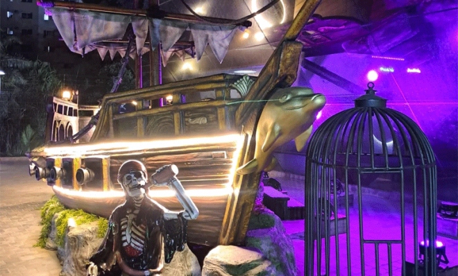 - Ambiente imersivo – Decoração de navio, baús do tesouro e até cascata interna!