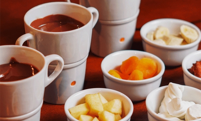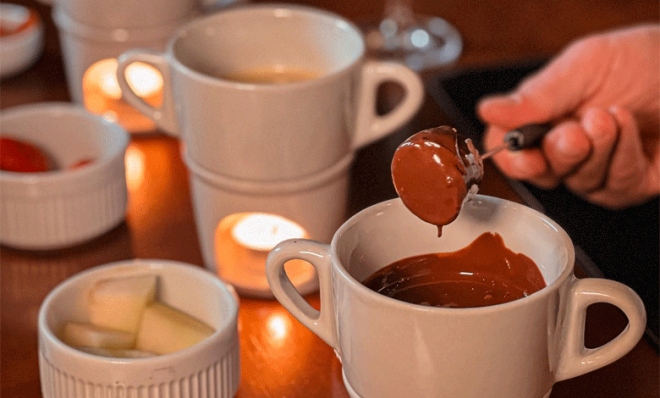 - Fondue Doce – chocolate derretido acompanhado de frutas e pães.