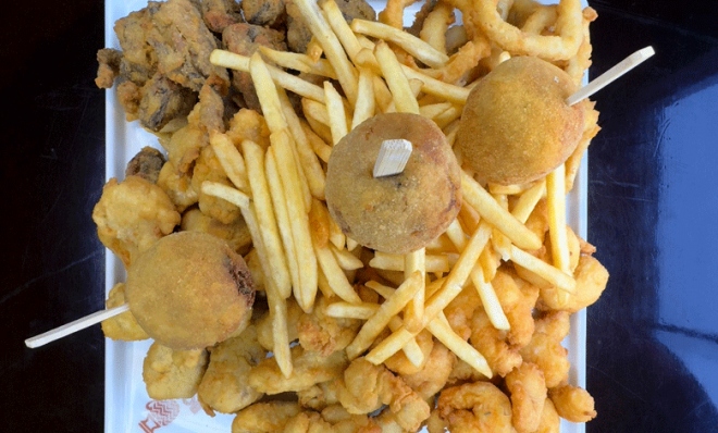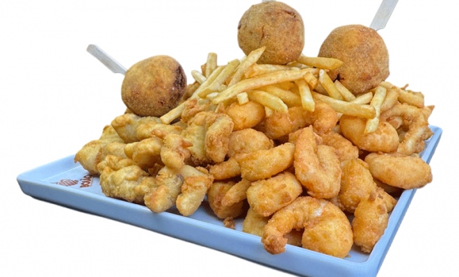 - FRUTOS DO MAR: camarão, lula, marisco, isca de peixe e bolinho de siri, tradicionalmente temperados e empanados, com fritas.