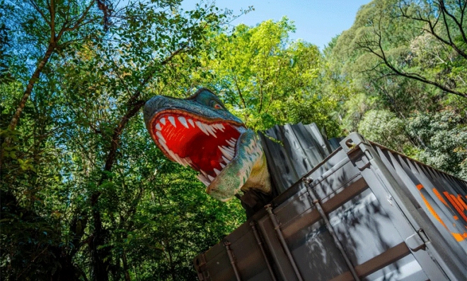 - • Trilha dos Dinossauros: Caminho repleto de réplicas animatrônicas em tamanho real que se movem e emitem sons.