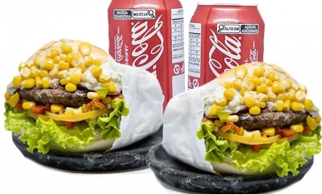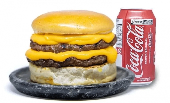 - OPÇÃO 2: hambúrguer duplo cheddar com pão, carne e queijo cheddar. Acompanhado de uma coca-cola lata 350ml, maionese caseira e sache de ketchup.