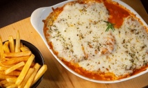 - Parmegiana de frango para 2 pessoas: dois filés de frango marinados empanados, fritos e assados ao molho sugo da casa para garantir uma carne extremamente branca, macia e suculenta com queijo gratinado.