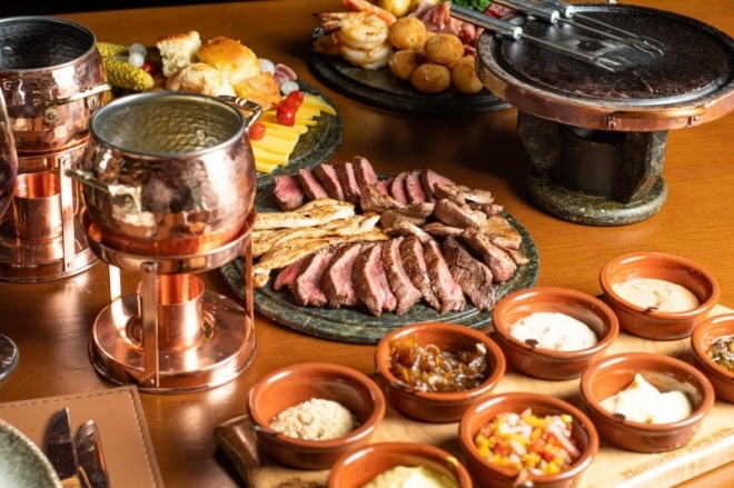 - Fondue de Carnes: cortes selecionados de filé mignon, frango, suíno e camarão, servidos com molhos, geleias e redução de vinho.