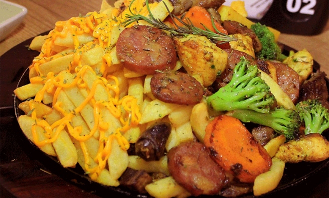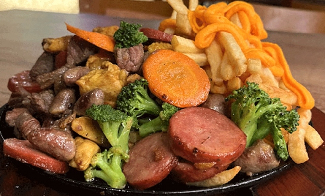 - TÁBUA: 150g de alcatra, 150g de frango, 150g de calabresa, batata com cheddar e bacon, polenta, aipim, brócolis, cenoura e 4 pastéis de carne seca.
