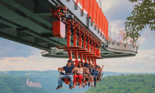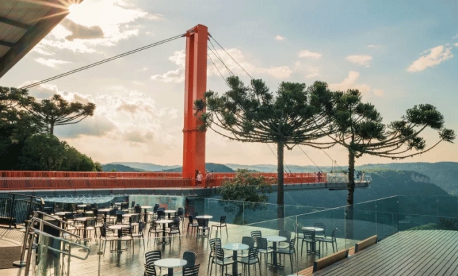 - • Mirante de Vidro Suspenso: Piso transparente que desafia a coragem e proporciona uma sensação incrível de estar flutuando sobre as nuvens.