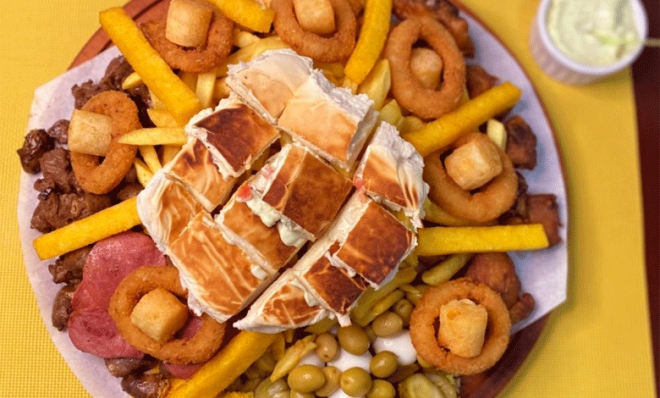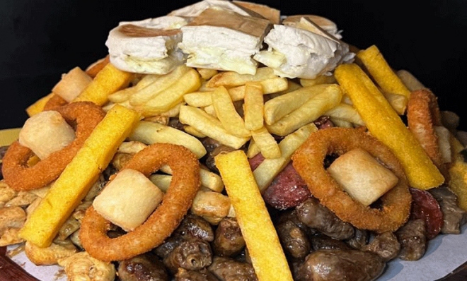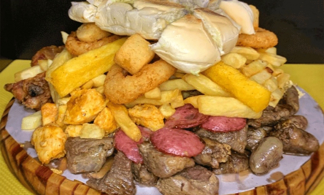 - TÁBUA PEQUENA: carne, calabresa, frango cubos, batata frita, polenta, aipim, cebola empanada, farofa, pepino, azeitona, ovo de codorna e pão com maionese da casa e vinagrete